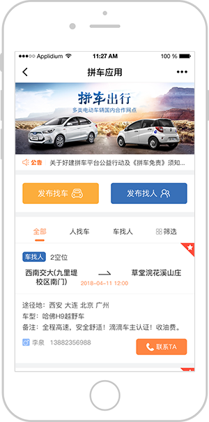 所有车主发布的找人信息,都可在拼车列表页中查看