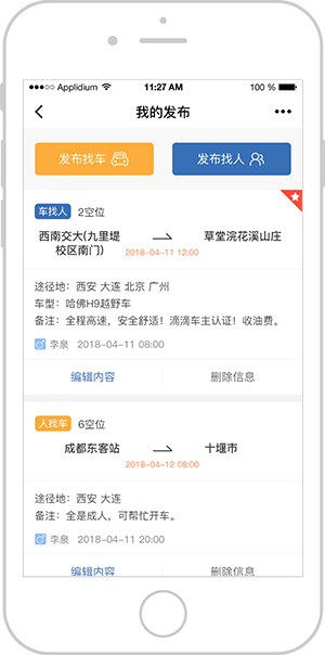 车主或乘客可对发布的信息进行实时修改或删除
